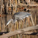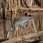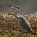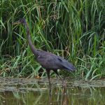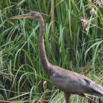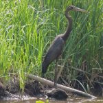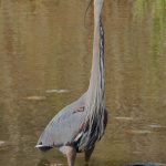So what do we have, other than an intriguing bird of the day? Certainly a young heron hatched this year; it is probably less than four months old and still dressed in its first basic plumage. Young Great Blue Herons are normally a dark, rather monochromatic, brownish. Today’s bird is not so different from ‘normal’, it’s a bit darker than average and lacking some of the pale brownish definition on feathers of the neck and wing that might otherwise make it more mottled. By late this year the grey-blue adult feathers will start to appear. It will be interesting to see if this bird survives the winter to return to this area and if it does, whether it shows any discernable darkness in its adult plumage.