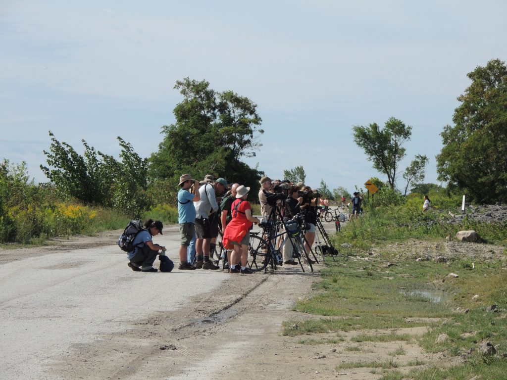 The setting for this gathering to examine a wandering bird-turned-extreme-rarity was a long spit of reclaimed land anchored at its east end to a corner of Toronto’s old industrial heartland and reaching out into Lake Ontario. The Spit, as it’s known, continues to grow as construction debris and excavated sub-soils arrive. As the trucks leave so trees and grasses take root making it a very green and leafy place popular with runners, cyclists and birders. It is a natural shoreline conduit for migrating birds and we noted many Eastern Kingbirds, Tree Swallows and Barn Swallows making their way heading south and west, and there was a brief flurry of excitement among the smaller birds as a Sharp-shinned Hawk cruised overhead, I half expected the Ringed Plover to fly away never to be seen again; but it stayed, making a day-long parade of birders happy.