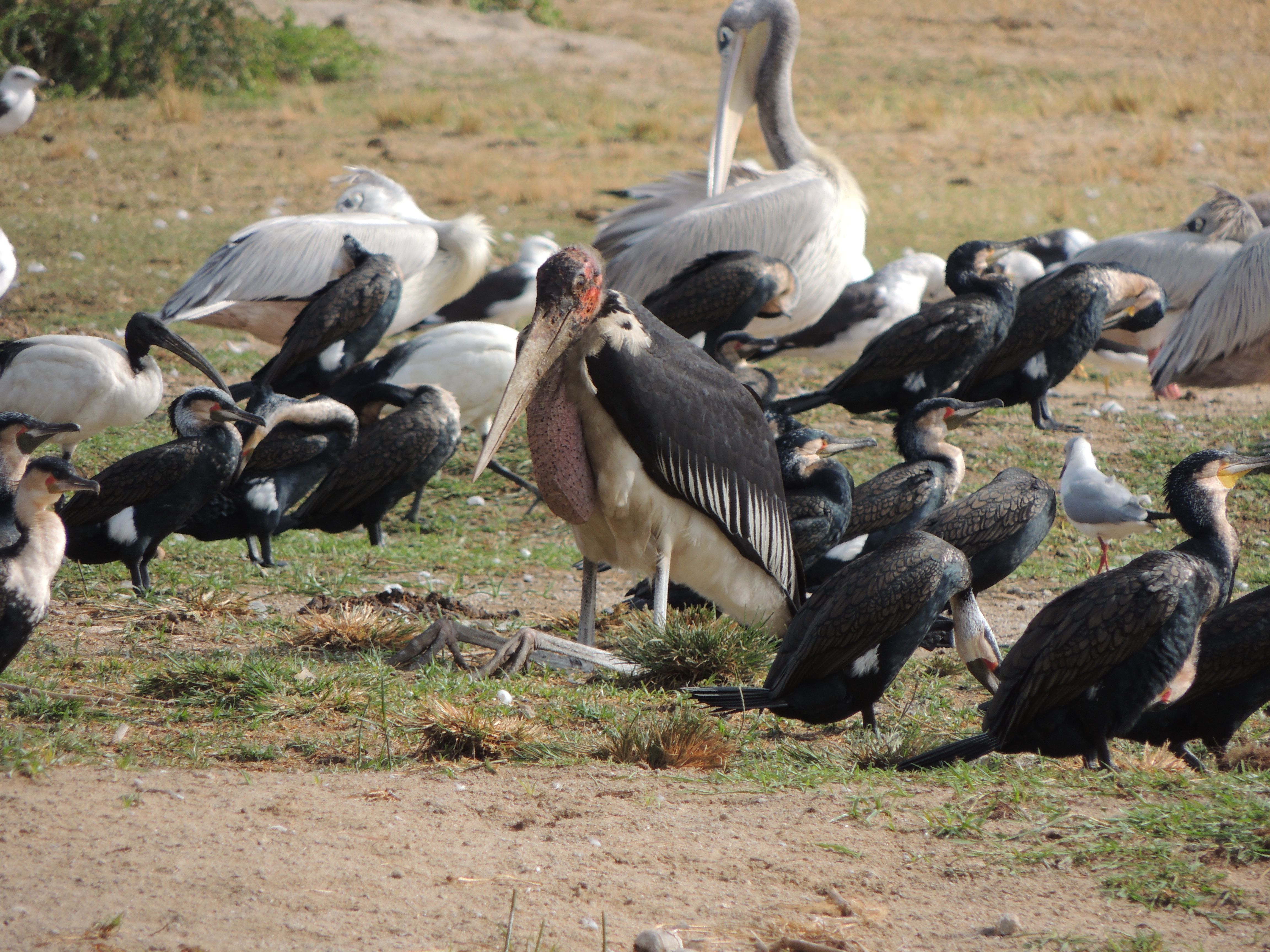 Previous ImageNext Image Pink-backed Pelican, Marabou Stork & Great Cormorants. Kazinga Channel QENP Marabou Stork, Great Cormorants, and Pink-backed pelicans