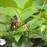 Turacos are a family of large arboreal birds, rather like overgrown pigeons. I’d seen both Ross’ and Great Blue Turacos on my first visit to Uganda a year ago and here they were again! Turacos in general are big and colourful, usually blue or green. The Ross’s looks like a large blue chicken with a surprised expression and when it flies, if you can overcome your gasps of disbelief, you realize it has long crimson-emblazoned wings.