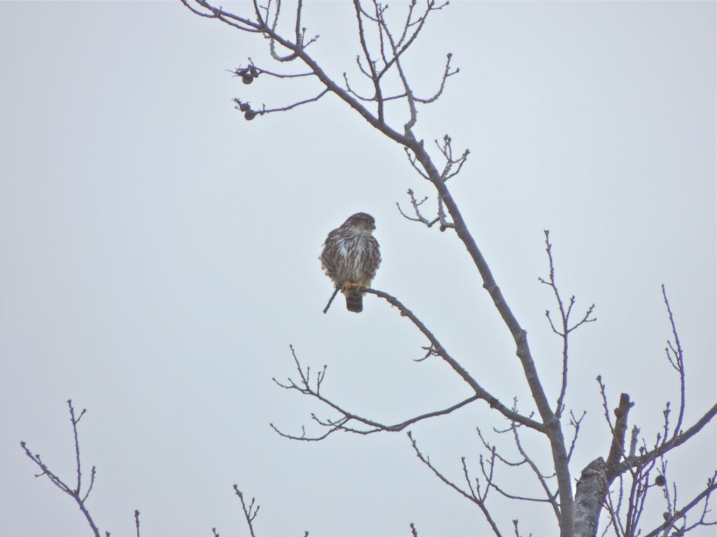 I would still be weighing which of the Redheads or the kinglets was my bird of the day had I not come across a Merlin as I approached the end of my census circuit. It was perching on the top of an exposed oak being buffeted by the strong northwest wind. I stared at it appreciatively taking in its overall brownness and strongly streaked breast, both key identification marks to distinguish it from an American Kestrel, the only other similarly sized North American falcon. It stayed long enough on its station that I was able to return to my car and drive to a reasonably close spot and take a number of photos. It is always tricky shooting a subject silhouetted against a bright sky or water, but I’m reasonably happy with the much computer-corrected results and very happy with the final shot below, as it took flight. So happy that it instantly became my Bird of the Day.