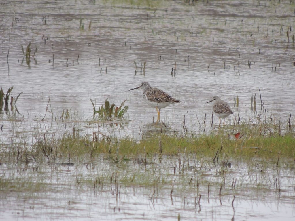 Today I had the rare opportunity of examining both Greater Yellowlegs and Lesser Yellowlegs side by side. In the photos above and below, the individuals show some slight differences in plumage but I think they only reflect slightly different stages in the individual birds’ spring moult. The difference in relative bill length is evident and with a bit of coaxing you might come to see the slight upturn of the greater’s bill.