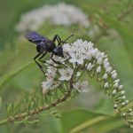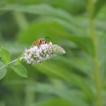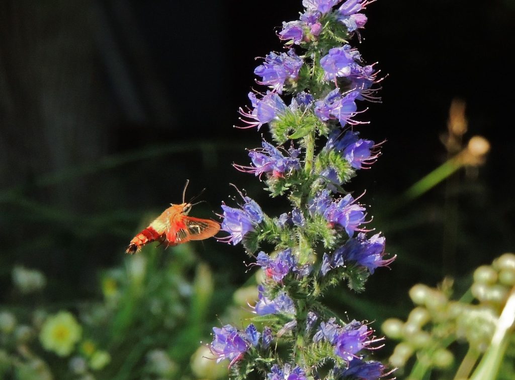 These evenly warm summer days bring out the pollinators like those above, insects mostly: butterflies, all sorts of gentle (non stinging) bees and wasps, and moths. All you need is a block of idle time spent in an unkempt expanse of knee-deep flowering plants to see them, the sort of dreamy, summer-light place that might inspire a Victorian poet to start scribbling or painter to unpack her watercolours. In this part of the world you have a reasonable chance of seeing a Hummingbird Clearwing hovering at a flower’s doorstep. They use their almost one-inch long proboscis to draw nectar from deep within tubular flowers.