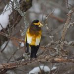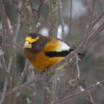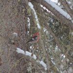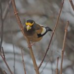 On this day my companions were determined to hike a snow-smothered trail on a second attempt to find a putative Black–backed Woodpecker. We had tried to find it yesterday but came up empty handed but, rather than traipse through the snow in pursuit of one bird, I opted to stay at the park’s visitor centre today. Birding from the observation deck was somewhat compromised by a light but steady snowfall but I can overlook a lot of discomfort when the reward is Evening Grosbeaks. I didn’t count them but I’d guess at perhaps twenty coming and going from a feeder loaded with sunflower seed.