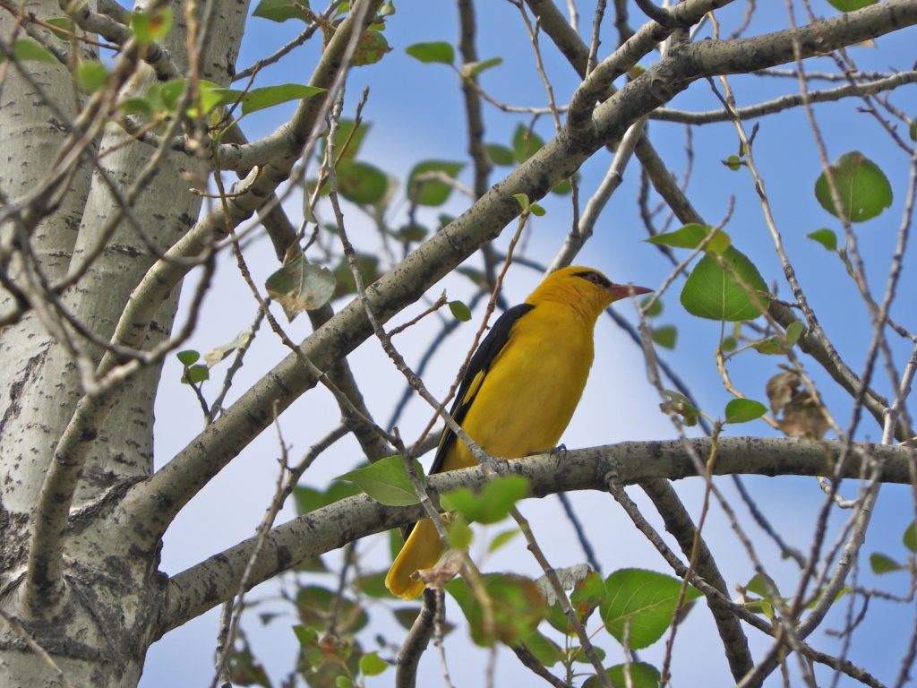Arslanbob was modestly interesting from this birder’s point of view, but it was late July and birds had stopped trying to be noticed. We watched young Common Kestrels diving from a cliff edge and mastering high-speed flight, I got a glimpse of a Yellow-breasted Tit and photographed an obligingly static Spotted Flycatcher. Best by far though was seeing a couple of Golden Orioles. Like so many of the birds I write about here, Golden Orioles were one of those childhood dream birds, like the European Roller and Citrine Wagtail, birds I’d seen in books but had never thought I’d encounter in real life. I’d had one or two glimpses, annoyingly fleeting ones, of Golden Orioles on my way down to Arslanbob and had read that they’re quite common. Then one lazy afternoon as I lay dreaming a hot afternoon away (lying because in our Uzbek host’s open verandah there were no chairs, only divans and cushions over thick carpets), I followed a new bird call to a nearby Poplar tree. It was of course this oriole dream bird and I was able to take several pictures. There was a twist in the plot though, when I turned to the relevant pages of my field guide I found that what I thought was a Golden Oriole was in fact an Indian Golden Oriole; a different species, not markedly different, it has slightly heavier black eyeline and a bit more yellow in its flight feathers, but a distinction that gave me a notional connection to the Indian sub-continent.