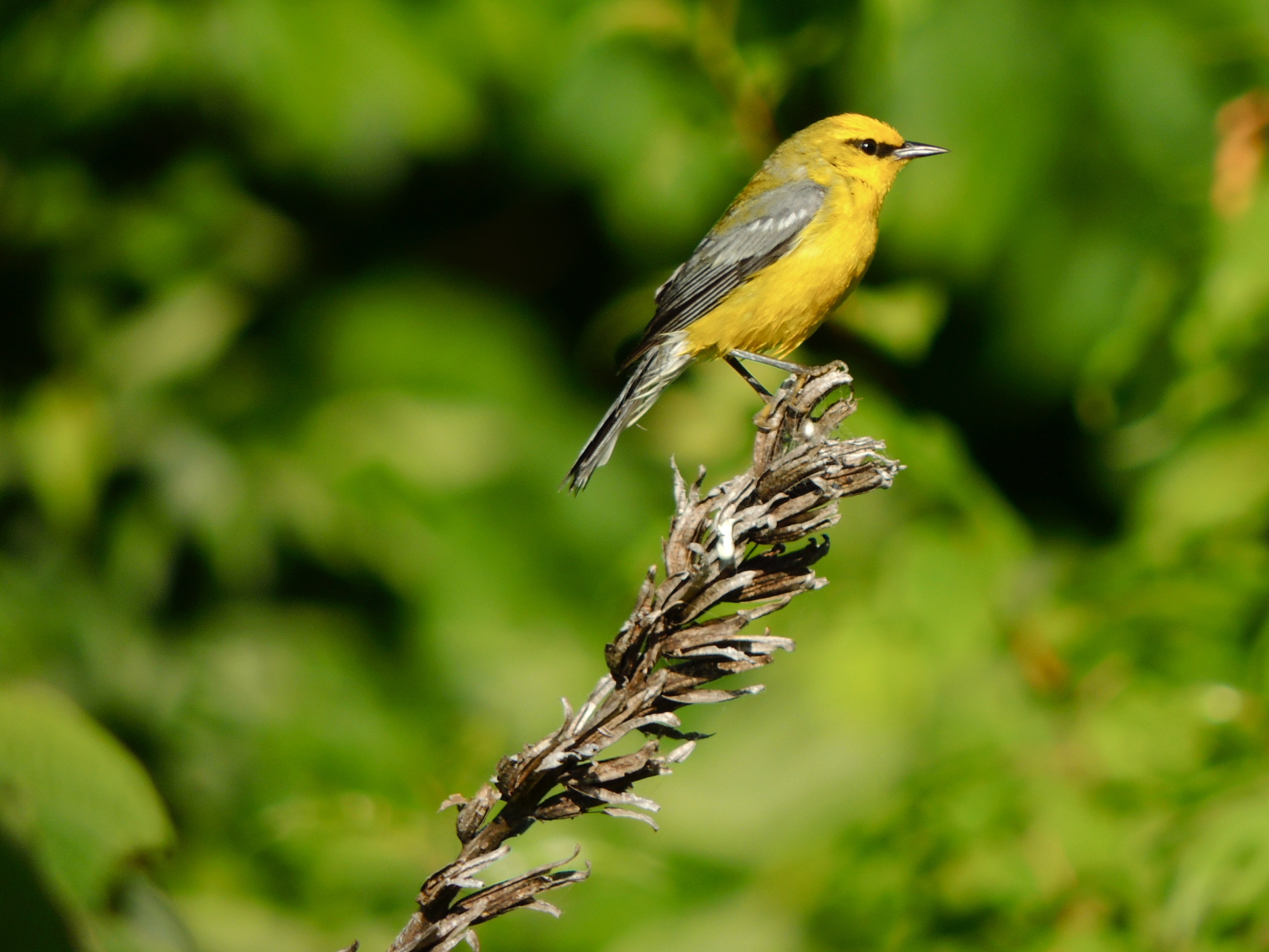 We did well to encounter 36 species three of which stood out in particular: three Black and White Warblers (two heard and one seen up close), a bonded pair of Black–billed Cuckoos, and, Birds of the Day, two Blue–winged Warblers. The two Blue-wings were on sentry duty, each on his own territory, and they monitored our presence closely. Like so many warbler species they are quite breathtaking to see and I like the way the black eye stripe seems to mirror the bird’s bill.