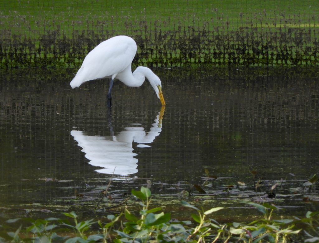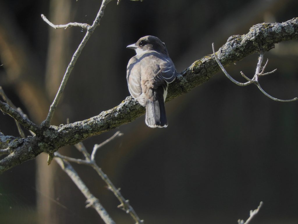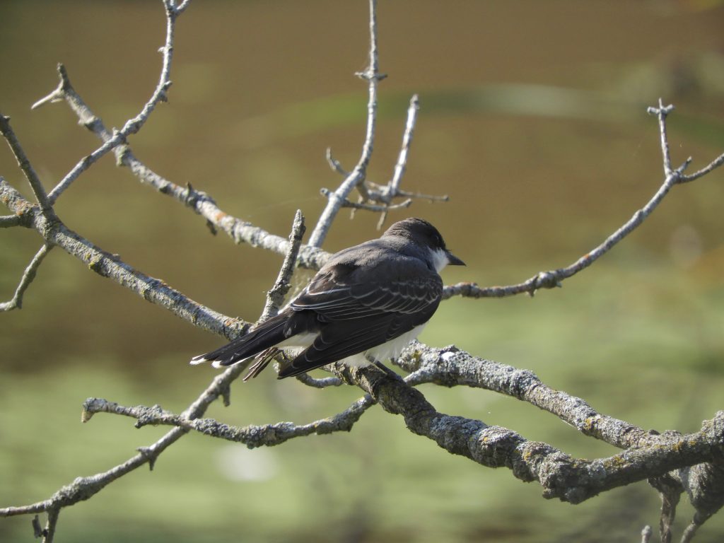 Perhaps the most captivating was this Great Egret. Caught in the bright light against a dark backdrop it made a nice picture reflected in the waters, it was my Bird of the Day although there were several other highlights. I watched a family group of Eastern Kingbirds for a while and in these photos, I think a parent/adult can be identified by the worn and tattered white tail-feather ends whereas the youngsters’ are new, tight and tidy. (Also, I think the youngster looks hunched and insecure.)