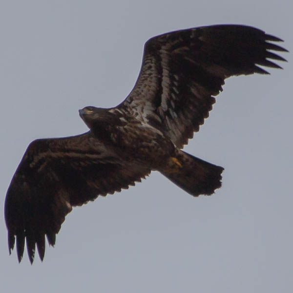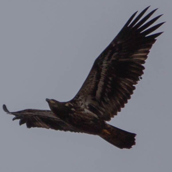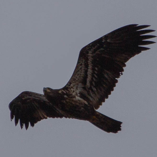 My rapidly firing thought-process went something like this, “Golden Eagle!?, Possible, – good time of year. But no, maybe a Turkey Vulture. Think about it. No, not a TV, too big and wrong flight pattern. Then what? Bald Eagle? Maybe a juvenile? – No, could be, but not all black. And certainly not an adult Bald. What else could it be? Must be Golden Eagle – check long tail? Yes. Terminal band on tail? Too dark, can’t make one out. Flight pattern? Steady beats. Must be a Golden Eagle. Yep, I think so – for sure – probably.