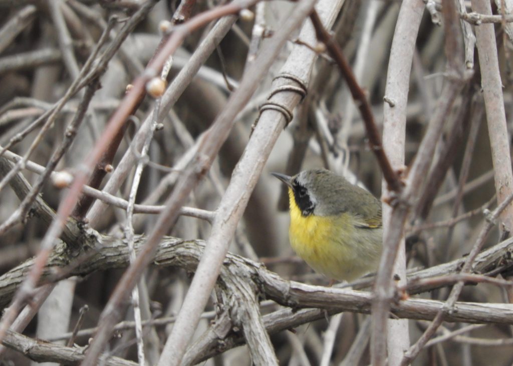 Making my way back to my car, I heard a Swamp Sparrow in full ‘this-bit-of-swamp-belongs-to-me’ song, he was so absorbed in it that I had little trouble getting photos of him. As I watched and listened I heard another song off to the right, somewhat familiar but a touch off-key. It took a minute or two to process but I thought I was probably hearing a Common Yellowthroat; their song is distinctive and bold and they are probably much more often heard than seen. But this song was tentative and perhaps a touch hoarse, I made a mental note, ‘possible Common Yellowthroat’ and then, moments later, it popped up right in front of me! We eyed each other for a moment before it flew to the other side of a small watercourse to hunt down a meal in a tangle of spring flood debris. This is him.