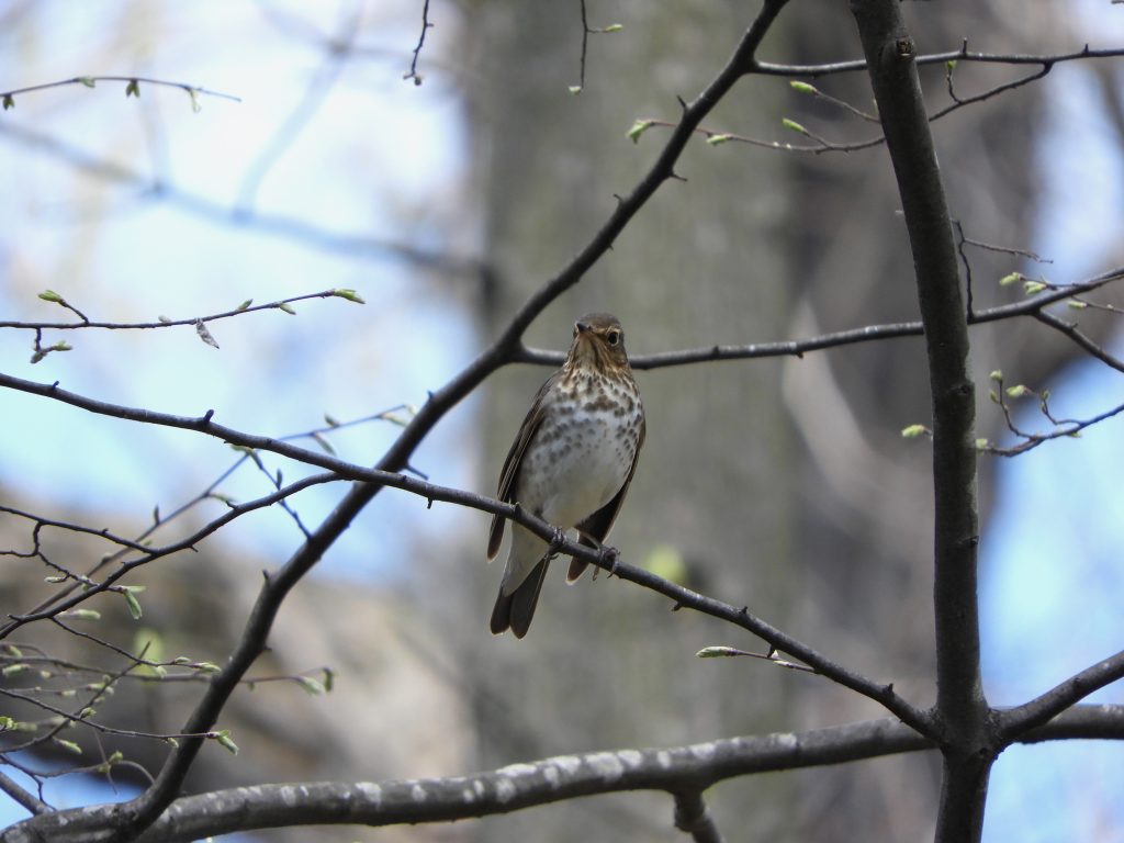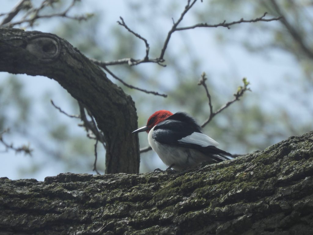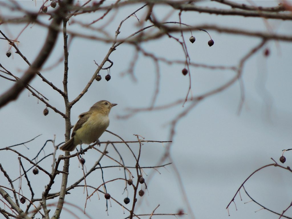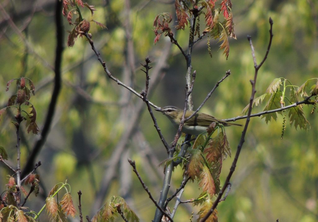 Much less common and my second vireo of the day was a Philadelphia Vireo, found lazily picking insects from the scarcely open canopy of an elm. We see Phillys infrequently and only as passage migrants on their way to and from the boreal forest where they are a widespread breeding bird. It might be easily confused with its near lookalike the Red-eyed Vireo (below) but the Philly is quite a bit smaller and the beauty of this bird is the subtle wash of yellow on its undersides. The Red-eyed, by the way, is a breeding summer resident here in southern Ontario and is a little more crisply marked than the Philly, their songs are almost identical which adds to the challenges in telling them apart. I’ll understand if you’re confused. Today’s Philadelphia Vireo was my Bird of the Day, just for being here.