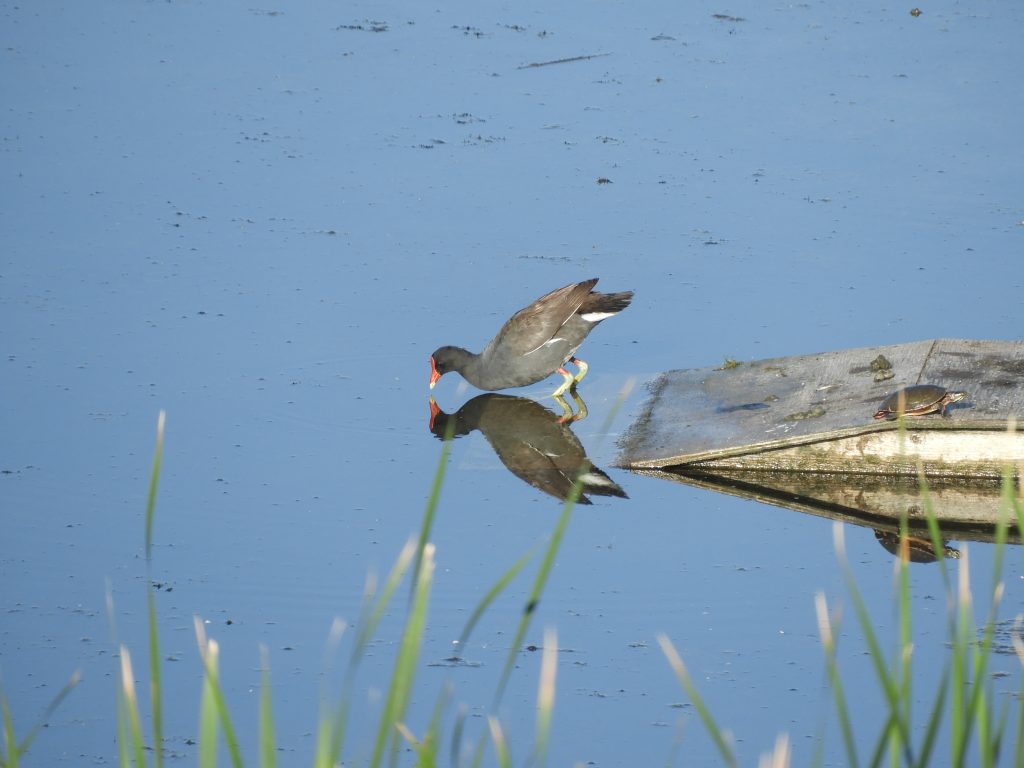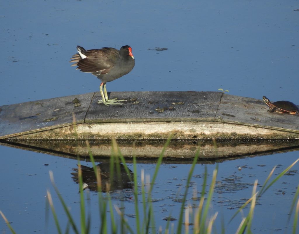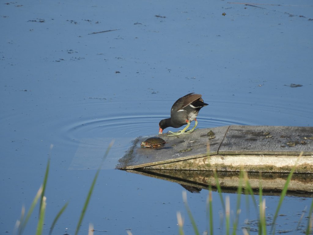 We watched the gallinule for quite a while, both of us with our cameras working overtime, I came home with around 350 photos to sort through. It was very photogenic, preening and occasionally dipping for something edible, note the little Painted Turtle sharing the platform.