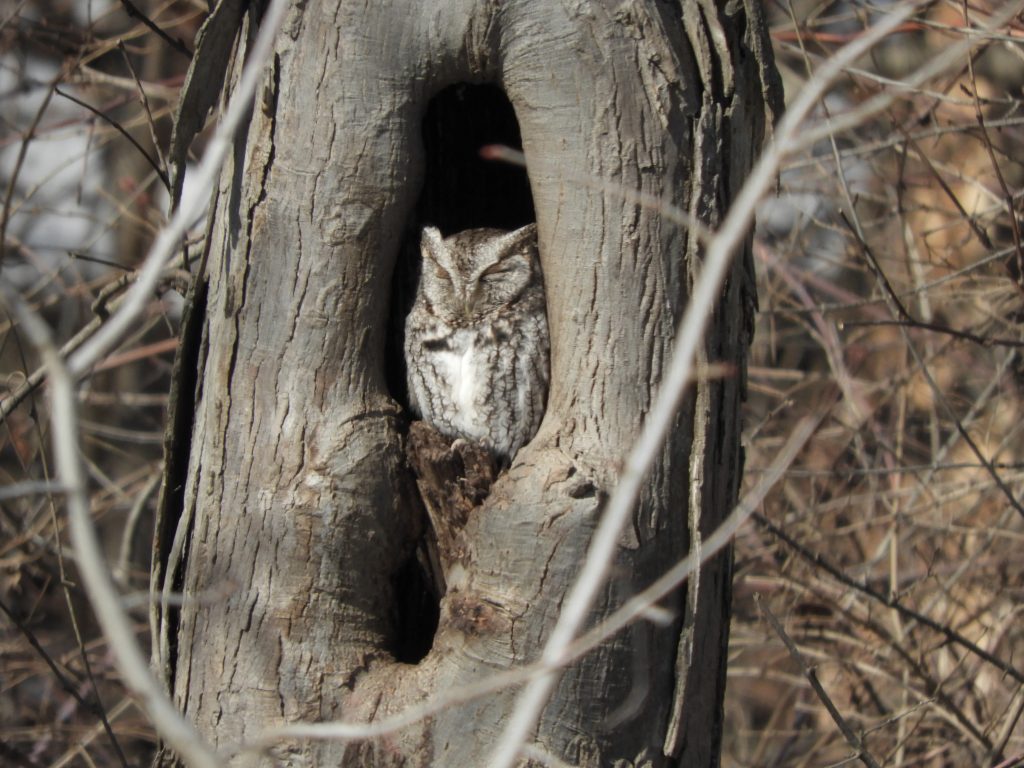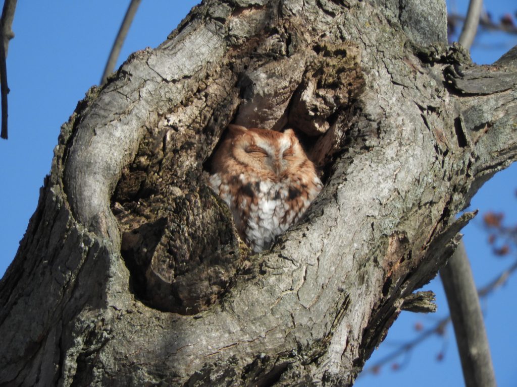 More conventionally but striking in other ways, was the pleasure of seeing two Eastern Screech Owls sunning themselves. I’ve written about them before, the grey one (above) just a month ago, and today it was standing tall exposed to the sun’s precious warmth. The red one was in a well-known owl-tree in a local cemetery, its presence was almost predictable. Screech Owls sunning themselves has become a mark of mid-late winter for me, a reminder that, while there’s plenty of cold ahead, the sun is gaining strength.