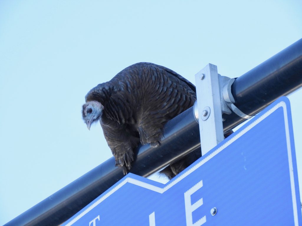 The turkey’s behaviour is bizarre and hard to explain other than to suggest that it’s got something to do with winter. There is a substantial flock known to inhabit an area of woodland and farm fields a couple of kilometres north, but it’s not like it’s a hop and a skip away. To get there means crossing a major railway line and a 6-lane highway among other man-made barriers; but Wild Turkeys are strong fliers. Who knows.