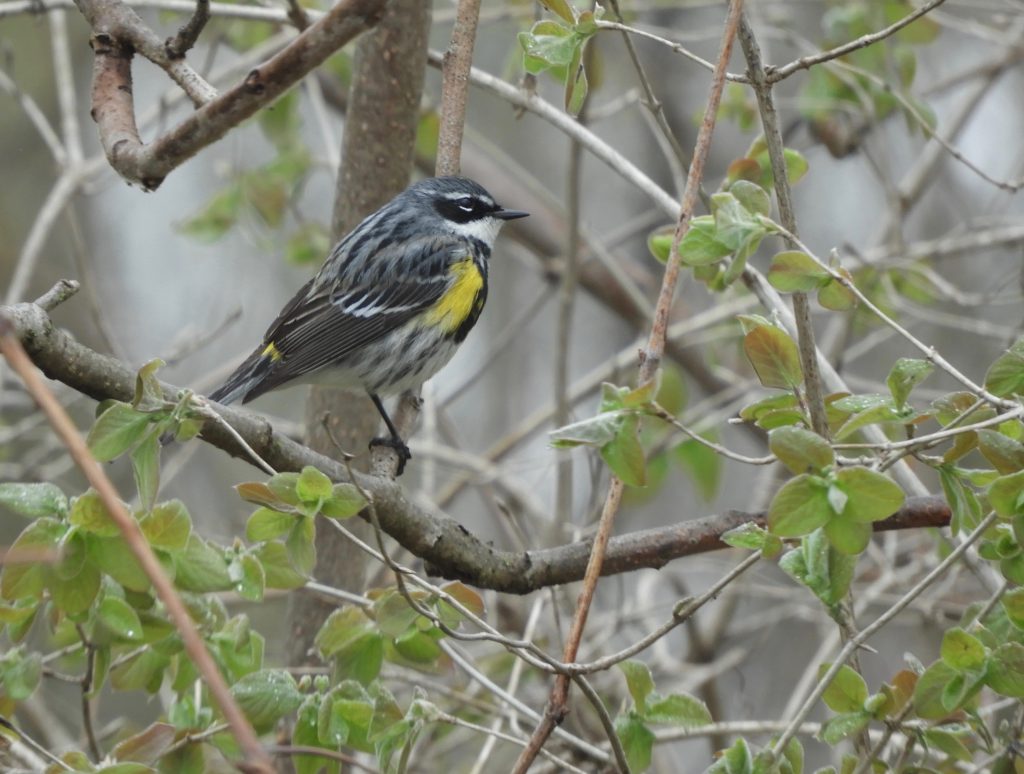 “Why go out?” you may ask. Well, fog in migration seasons can sometimes make very good birding days, it grounds birds that might otherwise fly over us. So I went to one of our spring-birding hot-spots and was rewarded with many first-of-the-year sightings and sounds. Many Yellow-rumped Warblers worked the tops of one or two trees and the male in the photo above eventually made his way down to my level. There should be many more Yellow-rumps to come in the next two weeks, probably enough for us to become blasé about them, today they were a delight as befits a pretty and handsome little bird.