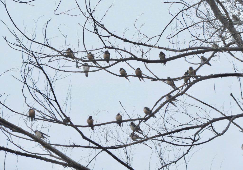 Moments later it took a short flight to a bare tree at the waterside where it sidled up to a handful of other swallows. Binoculars again, and I could see the group was a mix of Barn Swallows and Rough-wings. The Barn Swallows could have journeyed even further, at least 4,000 Km. anywhere from Central America to Patagonia.