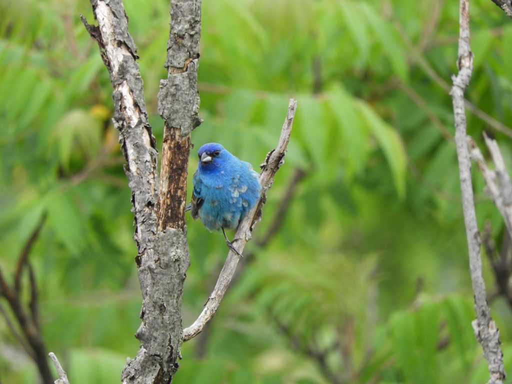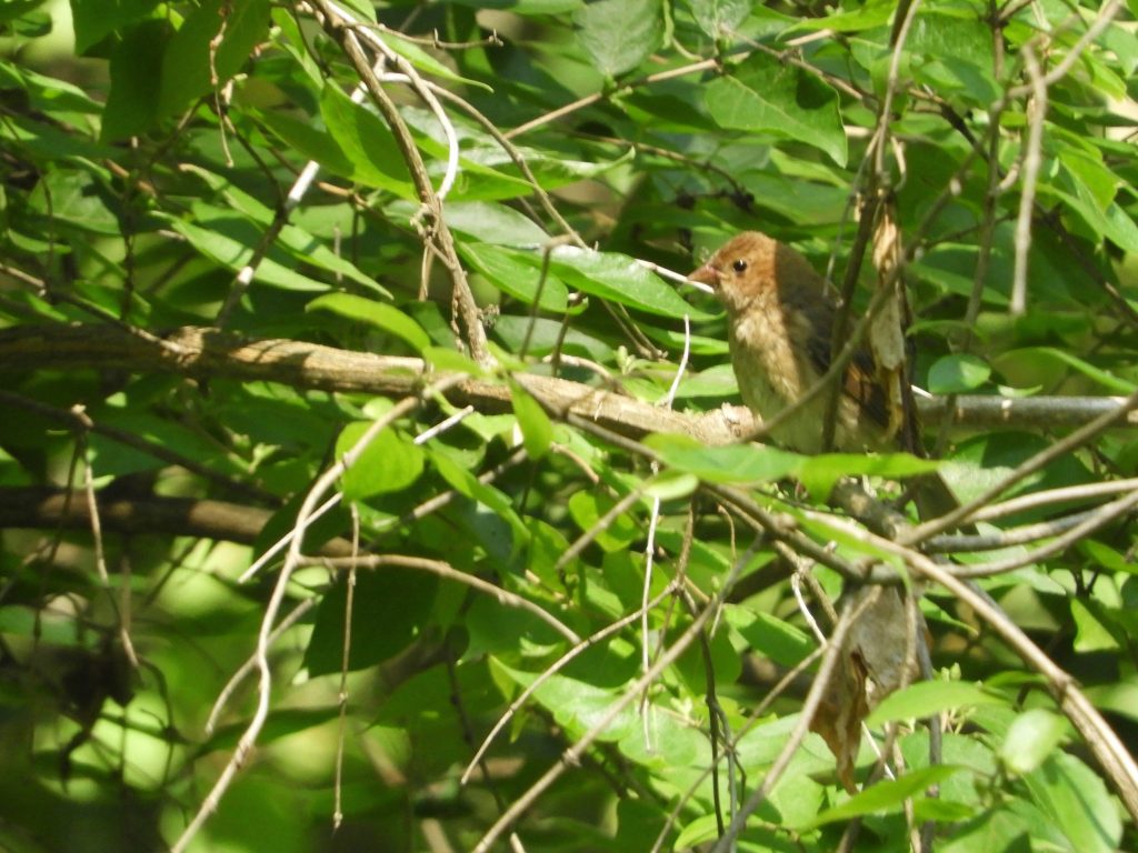 There were other sightings on this comfortable morning, a Coopers Hawk soared across the marsh putting to flight some of the smaller birds and in the distance two Bald Eagles soared around and over the site of this year’s nest. Then, as I made my way back along a woodland path, I disturbed an Indigo Bunting family, adult parents and fledglings. The adult male in breeding plumage is spectacular, but the female and young are as plain as can be as this photo of one of the fledglings shows.