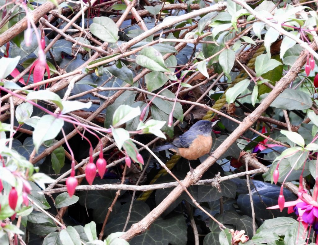 There was more. One of us suddenly noted a Cinnamon-bellied Flowerpiercer (above) working this same Fuchsia.  This was a surprising discovery; an unexpected bonus and we were all in a good position to study it. Other than that efficient flower-piercing bill, it looks rather like a small version of our familiar American Robin.  I take it from my more knowledgeable friends that it was a good sighting, so that made two, or maybe several, Birds of the Day.