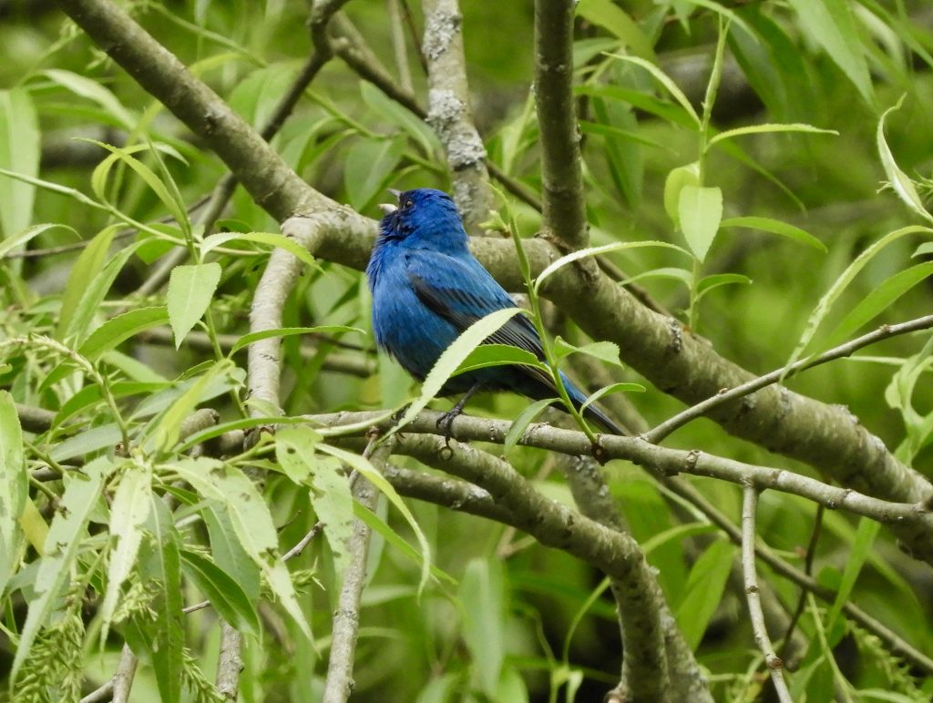 This day was cool, not a cloud in the sky, but a buffeting easterly wind made it chilly at times. The wind noise was distracting. I had reached the half-way point in this circuit, a stretch of path where deciduous woodland lays against a municipal playing field. The breeze in the trees made it impossible to spot any conspicuous bird movement but a nearby male Indigo Bunting flew up to a tree top, hopped from spot to spot briefly, grudgingly allowing just me enough time for one photograph. In the bird of the header bar you’ll see the blue brilliance is still emerging from dull brown as his spring moult completes.