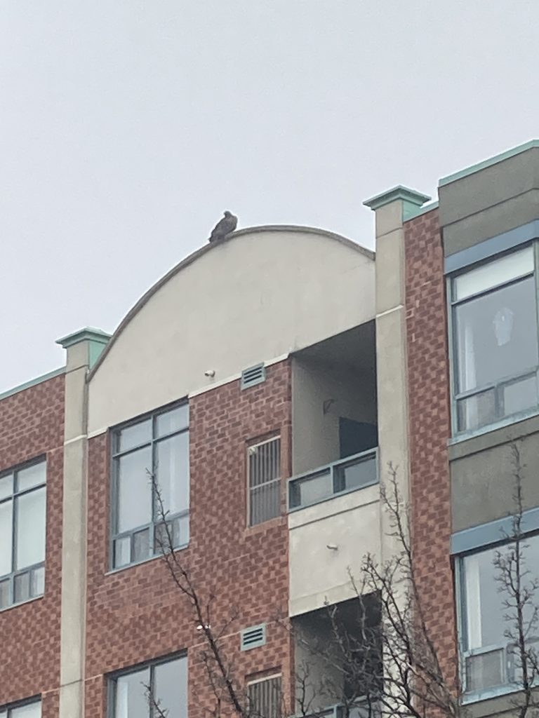 When I reached my destination and having paid for parking with a phone-app, (What an advance that is! If ever there is/was a barrier between provider and customer, it is the wretched pay-for-parking machine.) and as I made my way to class, I watched a Turkey Vulture slide out of the fog and settle on a nearby parapet wall.  This iPhone photo is the best I could manage.