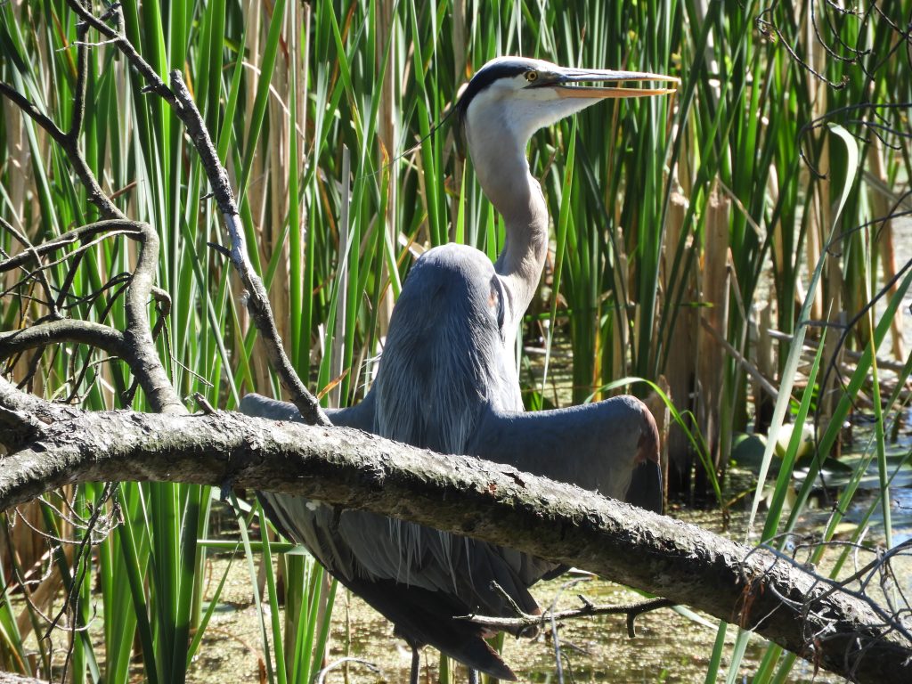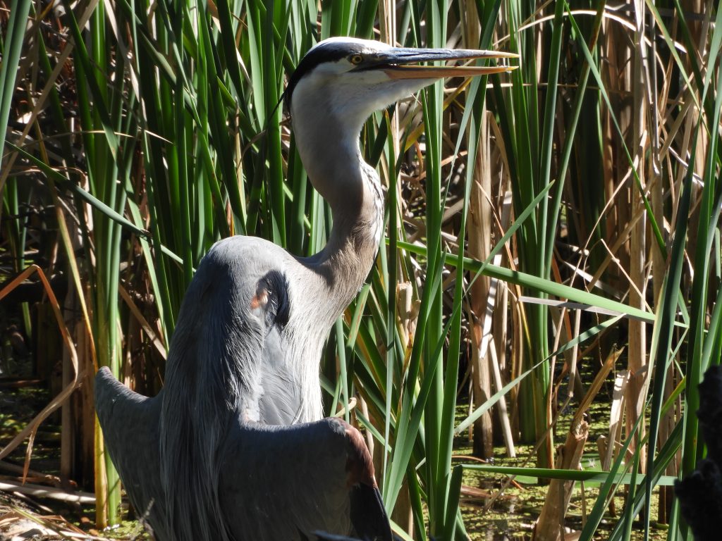I watched a Great Blue Heron standing quietly in raincoat-flasher pose, a posture that is explained rather mundanely by contributors to Cornell Lab’s Birds of the World thus, “Droops and exposes the inside of its wings on sunny days, perhaps to radiate body heat on warm days and absorb solar radiation on cool days” In another moment of misunderstanding I wondered if it was injured: through binoculars a reddish patch rimmed in black on its shoulder looked like an wound but zooming in shows it to be a detail of plumage that I had never seen before.