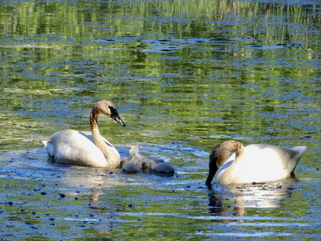 I went to the valley in anticipation of seeing this family of Trumpeter Swans, I half expected them to be the morning’s highlight. The adult pair has been in residence since early April and there was never any doubt they were there to breed. Their large pond-edge nest has been easy to monitor and just last week it seemed that hatching was imminent. Here’s the result, all five eggs hatched and all five cygnets look to be in top condition. Today the family fed together in a tight group, never more than a meter apart, the adults were using their feet to paddle the sediments and stir up food for the cygnets.