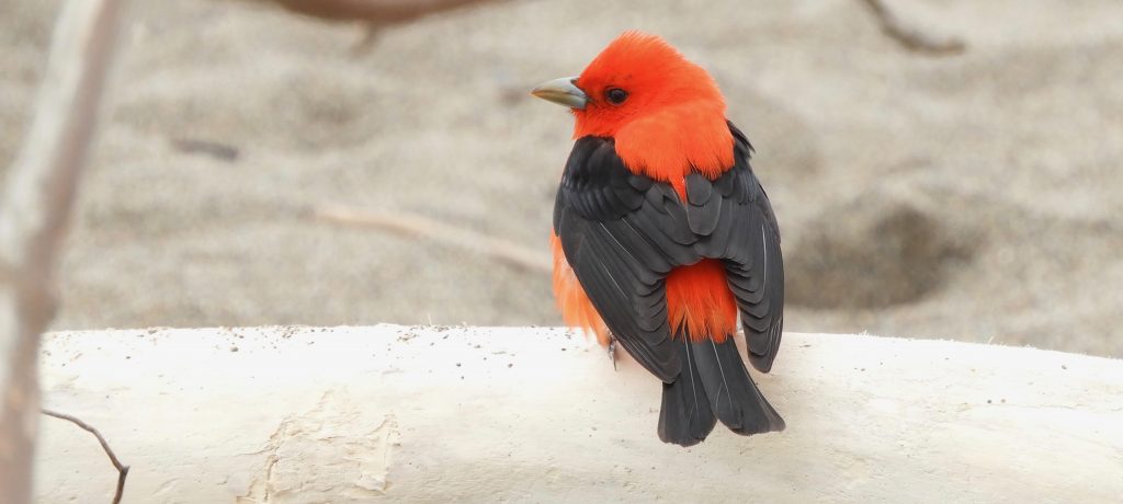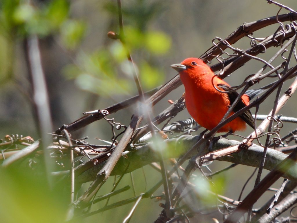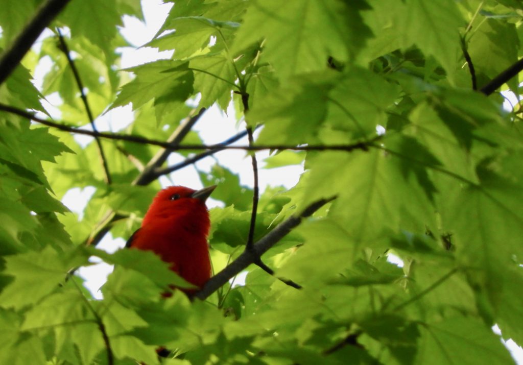 As I ambled a path that runs parallel to the creek I heard the thin I’m-watching-you ‘pip’ note of a Northern Cardinal. I soon found him just above me and saw one of birding’s curiosities, a bare-headed cardinal. He’s molting.