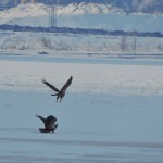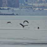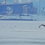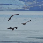 At the bird observatory, I bundled up and walked around my spring and fall census route compiling an interesting list of birds, including three petulant Killdeer and a Red-tailed Hawk driving a one-year-old Bald Eagle away from the hawk’s chosen nest site. Two male Wood Ducks flew past me following the river upstream with a flock of six male Mallards close behind. The Wood Ducks were squealing, as they do, like frightened piglets, a rather disappointing sound from a bird, which, in every other way, is thoroughly endearing.