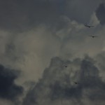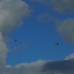Against a sky painted in angry swaths of grey and blacks set off against the purest blues and starkest white, I caught sight of the first swirl of dark shapes; Turkey Vultures I was sure of it. I kept my binoculars focused on them as they came closer. It was hard to count them and I made several attempts. Strung out over a kilometer or so, separated in height and at the same time rising and tumbling in the buffeting winds they were like an ever rolling tangle of black Vs. In the end I was pretty confident of my count of twenty.