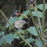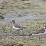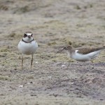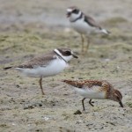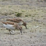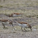 Ignoring the rankness of the situation I found two or three good places to sit quietly and let the birds come to me. I had plenty of time, at the best site an assorted flock scattered with my arrival, but betting that they’d return I sat quietly and in time they came back. First a couple of Semi-palmated Plovers flew in, then a small squad of Least Sandpipers hiked over whereupon they all mingled together. The plovers, being of a nervous tribe, were always on the look out for trouble, they’d pick, look up, then run a few paces, look up, then pick again. A Spotted Sandpiper flew low over the open water to join in the feast and it fed greedily using its somewhat longer bill to slide in to the morass as horizontally as possible; perhaps it knew something the others didn’t.