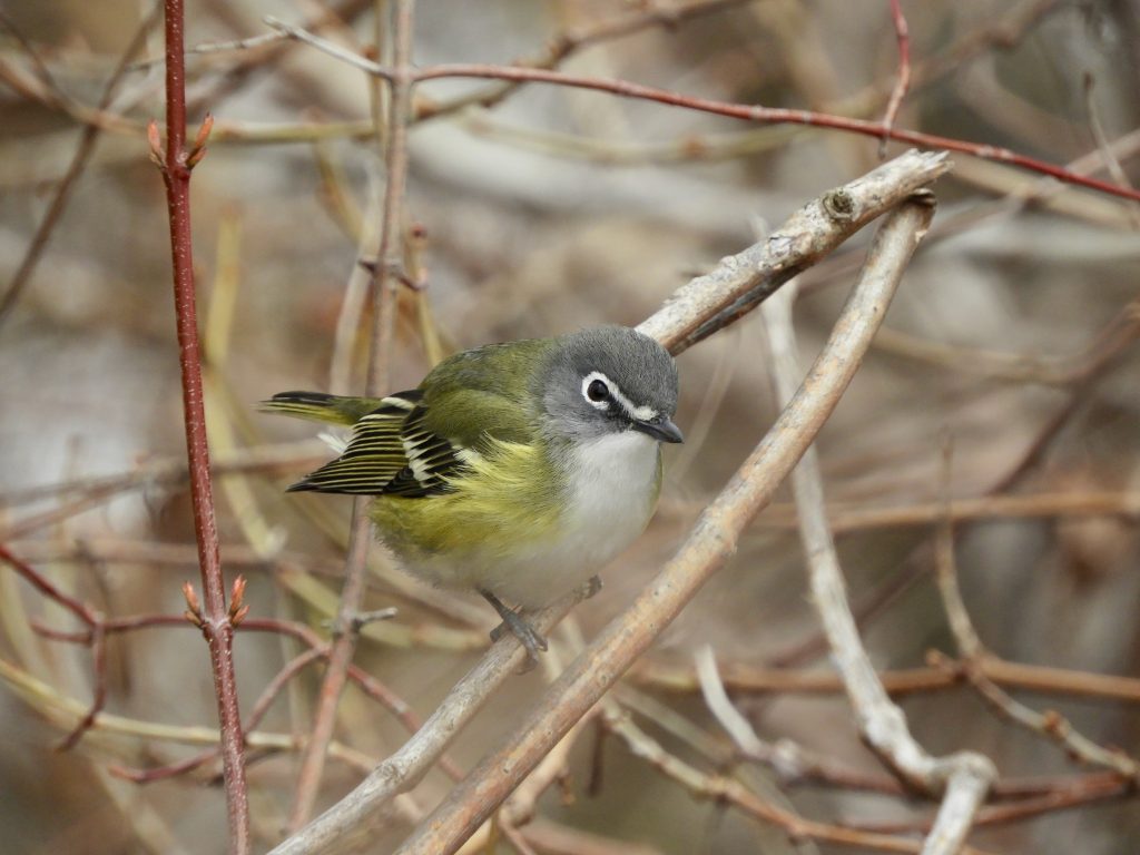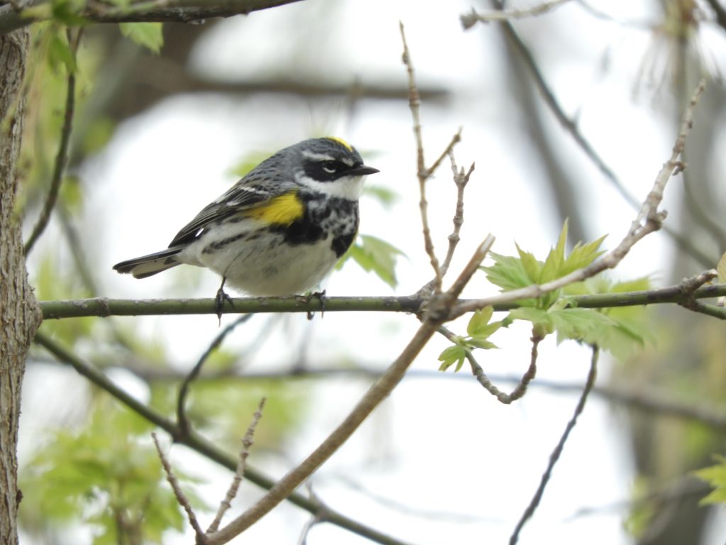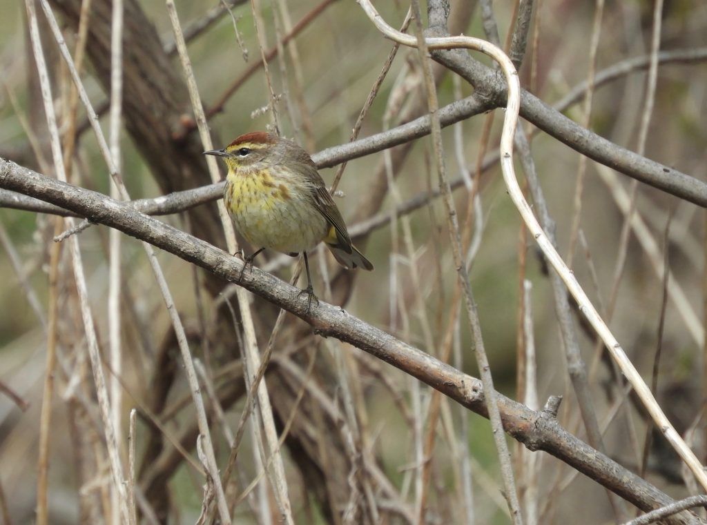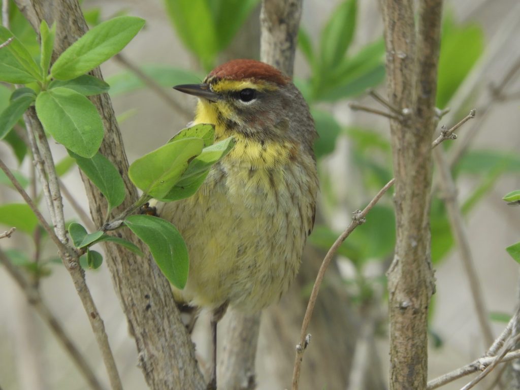 But that breeze was working for me, I’m sure it was aiding migrant warblers make a corner-cutting jump across the lake. If you were to look out over the lake you might see gulls, cormorants and mergansers on the water but you’d never spot a tiny, airborne warbler heading towards you, but I’m sure they were there. And I think their landfall was those trees and shrubs and vines all around me. So, one minute nothing and the next a Palm Warbler would be picking its way through the cast-ashore debris, then another or maybe three. In time they’d move on, moving inland and might be replaced by more Palm Warblers, a Yellow–rumped or a Black & White Warbler; and so it went on for an hour or two, or for as long as I had the patience to stay there.